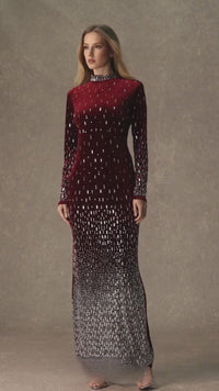 An elegant statement gown adorned with shimmering crystal embellishments that cascade in a refined gradient. Designed with a sleek high neckline and long sleeves for a sophisticated, evening-ready silhouette.